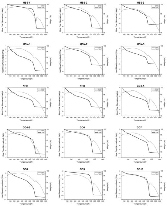 Thermal analysis of the samples revealed weight loss and endothermic reactions across four temperature intervals: below 120 °C, 120–200 °C, 200–600 °C, and above 600 °C (Figure 15, Table 3) [43,44,45,46].