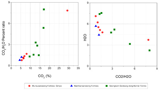 The samples from the Godeung-dong tombs in Seongnam exhibited a broader compositional range. Their SiO2 content ranged from 33.57 to 49.22 wt%, Al2O3 ranged from 5 to 10 wt%, and CaO ranged from 6.38 to 9.32 wt%. The LOI values ranged from 15.02 to 23.53 wt%, reflecting compositional differences tied to the specific structural remains. Notably, MgO was detected in a range from 1.79 to 9.31 wt%, suggesting the possible inclusion of dolomitic limestone.