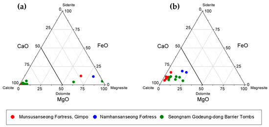 Plotted Ca-Fe-Mg diagram of lime lumps. (a) SEM-EDS and (b) WD-XRF.