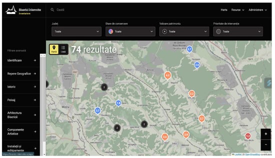 The visualization of the content can be carried out either in the form of a map (see Figure 1)—with pins having colors related to the state of conservation and numbers related to its value—or in the form of a list, whose columns cover the name, location, dating, state of conservation, value, and prioritization. Based on the scores obtained from the state of conservation and value assessment, an algorithm was developed to rank the wooden churches (in order of conservation or value issues or taken together) and to prioritize the necessary conservation/restoration actions, enhancement, and responsible advertising.