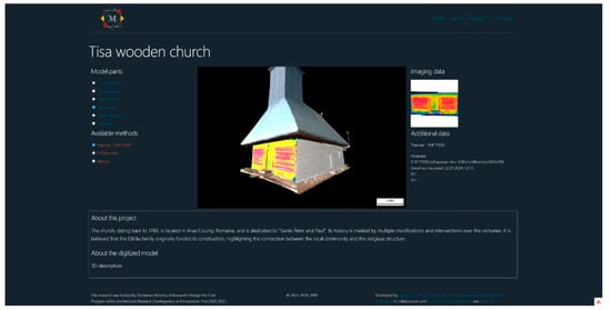 To illustrate the capabilities and outcomes of the platforms discussed, this section presents a case study on the Tisa, Arad County, wooden church (see Figure 3). This monument, a representative example of Romania’s wooden cultural heritage, was selected for 3D digitization and multi-modal imaging to demonstrate the integration and application of advanced documentation methods. The collected data were processed and made available through the 3D-VIMM platform, showcasing its versatility in visualizing and analyzing heritage information. Furthermore, the results were cross-referenced and linked with the Biserici Înlemnite database, enriching the broader inventorying documentation.