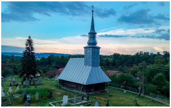 In the last century, however, the departure from traditional techniques and practices, accompanied by the movement of the population towards urban areas and the desire for modernization, has created a bleak context. The wooden heritage is increasingly difficult to maintain due to the lack of craftsmen and powerful communities to protect it [,]. The conservation problems derived from the aforementioned context materialize in the form of specific degradation of the building material, which is strongly influenced by environmental factors, as well as by non-conformist interventions, without proper craftsmen or documentation. Most of the time, the scientific data relating to these wooden buildings are scarce and sometimes even erroneous, the communities have largely lost touch with the craft, and although this type of construction forms a large part of Romania’s cultural heritage, the exact data on their history, the craft used, the places where they were first built, the schools of painters who contributed to their decoration, the sense of their position in the general landscape, and their functionality and the practices associated with these places are often unknown. Detailed research on wooden churches is, in this context, necessary to safeguard and properly value them.