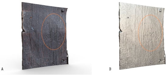 A 3D view of the section with the inscription: (A) color view; (B) surface detail view (Matcap).