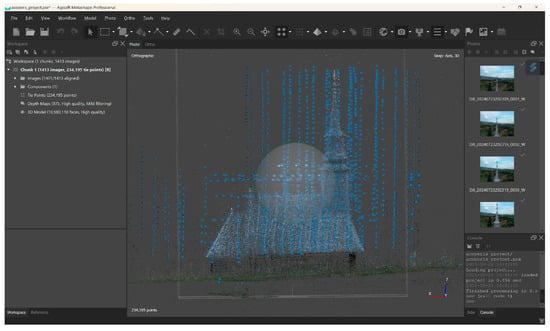 The exterior walls were digitized from the ground level using terrestrial photogrammetry, employing a Sony AR3 professional camera with a full-frame mirrorless sensor (42 megapixels). The Tamron f2.8 17–28 mm lens, set at a focal length of 17 mm, was used for the recordings. A total of 6908 RAW images were captured, with special charts for white balance and color profiles.