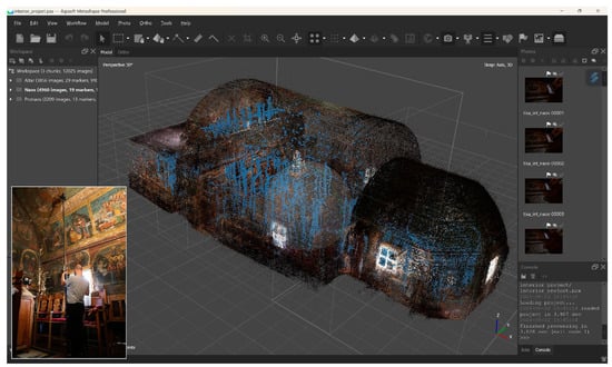 To implement and test the proposed concept, 3D digitization, using photogrammetry, of both the interior and exterior of the church was performed for a unified presentation. Photogrammetry was the only method used in this case due to its versatility for aerial/terrestrial/interior seamless compatibility [] but especially for the color correction required for interior wall paintings. The budget was also one of the deciding factors. The processing workflow consisted of image processing of the RAW files with white balance and color correction (batch processing with Adobe Lightroom Classic).
