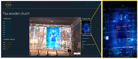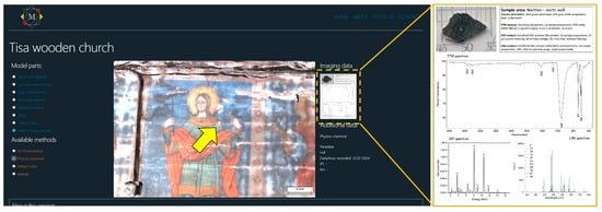 While this instrument was developed as a digital humanities tool to centralize, analyze, and share data about the wooden churches, 3D-VIMM (https://3d-vimm.luthonium.com [accessed on 6 March 2025]) was designed as a 3D and scientific multi-modal imaging data visualization tool and repository for 3D digitized heritage buildings []. With an intuitive UI, users can examine a heritage building in 3D, with the platform offering options for the investigated areas of interest and the types of image data available. Thus, the same user can choose between visible-type visualization (displaying natural color), thermal imaging, multispectral imaging (ultraviolet or near-infrared), laser Doppler vibrometry, or any other type of imaging investigation. Additionally, 3D-VIMM supports advanced functionalities such as mapping humidity measurements on the monument’s surface, overlaying physicochemical investigation results (e.g., LIBS, FTIR, and XRF) with corresponding spectral data hotspots on the 3D model, and integrating data from microclimate sensors. This comprehensive approach allows an enriched understanding of the monument’s condition and environment, fostering better conservation and restoration strategies.