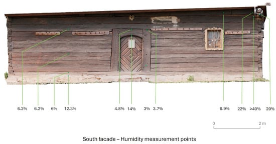 For the humidity measurements display, new textures were generated for all the walls by adding colored spots on the exact positions of the measurements. A special explanatory image was created (see Figure 10) for each wall indicating the humidity values. All the measurement points have coordinates recorded as well (distance from the ground and one of the lateral walls), so in future developments, these values can also be mapped directly in the 3D scene through different solutions (empty objects or hotspots).