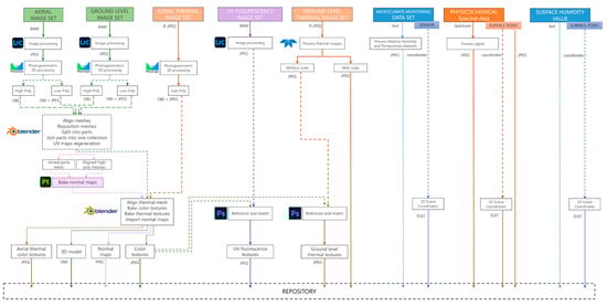 Figure 12 depicts the entire workflow for all the data sets from data acquisition, through processing and data preparation for the online repository and interactive view on a web page.