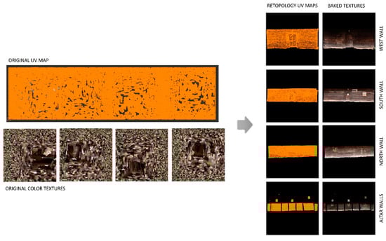 Exterior walls—original UV maps and color texture vs. UV maps after retopology and the new baked textures.