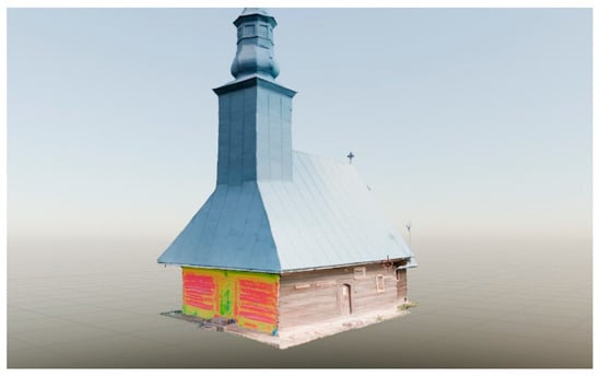In this case study, the Tisa church 3D digitization resulted in three generated 3D models: the roof, exterior walls (Figure 13), and interior areas. For the 3D-VIMM platform, the singular 3D model that was uploaded contained one mesh for the roof, four meshes for the exterior walls, and four meshes for the interior. The aerial thermal photogrammetry resulted in another 3D model with a thermal texture that was baked in Blender as a new texture for the roof of the uploaded 3D model.