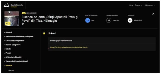 At this stage, the two platforms are not yet designed to work seamlessly together, and their integration relies on manual linking. Currently, hyperlinks are inserted (see Figure 15) in specific sections of a monument’s page to direct users from one platform to the other. For example, on the Biserici Înlemnite page dedicated to the Tisa wooden church, hyperlinks are added in the section detailing the humidity levels of the wood beams, leading users to the 3D-VIMM platform, where the same data is visualized on the church’s 3D model. Similarly, in 3D-VIMM, the monument’s description includes a dedicated field for external links, allowing for a direct connection to the corresponding Biserici Înlemnite page.