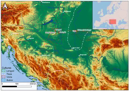 ’Whitestone’ as the raw material used for making polished stone tools has always been discovered in association with Tisza and Lengyel cultures in the Southern Great Hungarian Plain and Southern Transdanubia in the territory of present-day Hungary. The Tisza culture dates back to the Late Neolithic, 5000–4500 BCE, across the entire Great Hungarian Plain; however, it is strongly related to the Tisza River and its smaller tributaries [13,14,15,16,17]. The Lengyel culture (Lengyel I-II) is dated to the Late Neolithic period of 4900–4500 BCE in Transdanubia [15,18,19,20].