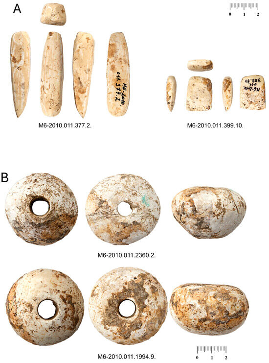 The polished stone tools made from ‘whitestone’ represent smaller-sized artefacts (see height, length, and width data in the Supplementary Materials Table S1) compared to polished items of other lithology from the same lithic assemblages. This difference may correlate with the tool types of ‘whitestone’ items, i.e., the vast majority of ‘whitestone’ polished stone tools are adzes and chisels, and the common feature is the “flat form” due to the thin cross-section. The ‘whitestone’ artefacts are represented mainly by small-sized chisel tool types with highly similar morphometrical appearances. For instance, the macroscopically studied ‘whitestone’ adzes and chisels in the Alsónyék assemblages have an average length of 45 mm (min: 20 mm, max: 92 mm), a width of 32 mm (min: 12 mm, max: 70 mm), and a thickness of 14 mm (min: 4 mm, max: 51 mm) [66]. We applied the typological system that Dragana Antonović described and used for the polished stone material at Serbian Vinča sites [6]. We characterized the longer items as adzes, such as shoe-last (shaped) adzes, and the smaller, flat polished items as chisels (see Figure 2A), which are mostly the previously mentioned highly similar mass-produced items [6]. The third tool type is the maceheads, which are the only perforated ‘whitestone’ items in the investigated lithic assemblages (Figure 2B).