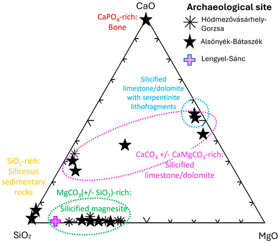The detailed study of the chemical-mineralogical composition of ‘whitestone’ polished stone tools resulted in four main compositional types. The most common MgCO3- and SiO2-rich type predominantly contains micritic magnesite and quartz–chalcedony, thus it can be interpreted as a silicified magnesite rock. The second most abundant type of ‘whitestone’ is the CaCO3- or Ca-MgCO3 (and SiO2-)-rich type, which is composed of calcite–dolomite–siderite, quartz, and iron oxides. The lithology of this fine-grained type is limestone and/or dolomite with the variable extent of silicification (silicified limestone/dolomite). In addition, this type occasionally contains remnants of the parent (unaltered) rock, which—based on the calcite–siderite–iron oxide accumulations and weathered serpentinite lithofragments (serpentine minerals–pyroxene–chlorite–spinel)—was serpentinite. There are subordinate types of ‘whitestone’ with CaPO4-rich and SiO2-rich compositions; these are fresh or lithified bone (apatite) and siliceous rock varieties.