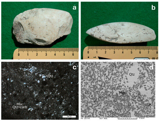 The most common type of ‘whitestone’ proved to be the MgCO3- and SiO2-rich type (Figure 4a,b). Based on detailed microscopic investigations, this is a micritic carbonatic and siliceous rock with crystalline quartz and chalcedony (Figure 4c). Mineral chemical investigations identified magnesite as the predominant carbonatic mineral phase (Figure 4d). Previously, X-ray diffraction analysis of a ‘whitestone’ chisel from Lengyel (WMM 1/933-221) belonging to this ‘whitestone’ type identified magnesite and quartz as the only mineral phases [34].