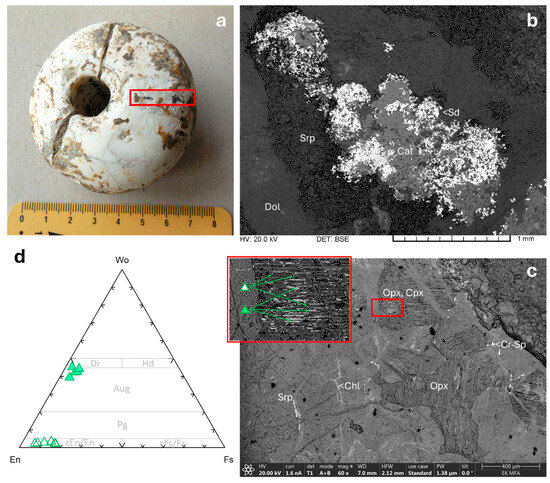 Macroscopic appearance, microscopic texture, and mineralogical composition of CaCO3- or Ca-MgCO3 (and SiO2-)-rich type of ‘whitestone’ polished stone tools. (a) macehead (Alsónyék-Bátaszék, Any-19) made from a rock with white carbonatic matrix (dolomite) and dark green-black lithofragments (photo: Gy. Szakmány), (b) SEM-BSE image of the dark lithofragments (composing of serpentine minerals (Serp), siderite (Sd) and calcite (Cal)) and the white matrix (dolomite (Dol), Alsónyék-Bátaszék, Any-19), (c) SEM-BSE image of the dark lithofragments (composing of serpentine minerals (Srp), ortho- and clinopyroxenes (Opx, Cpx), chlorite (Chl) and chromium-rich spinel (Cr-Sp)) (Alsónyék-Bátaszék, Any-23) (b,c photos: Z. Kovács), (d) chemical composition of exsolution in pyroxene crystals (with monoclinic diopside (Di) and rhombic enstatite (En) compositions) (graphics: V. Szilágyi).
