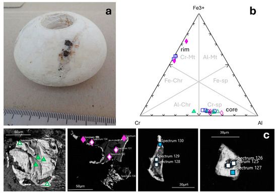 Macroscopic appearance and opaque mineral composition of CaCO3- or Ca-MgCO3 (and SiO2-)-rich type of ‘whitestone’ polished stone tools. (a) macehead (Alsónyék-Bátaszék, Any-23) made from a rock with white carbonatic matrix (dolomite) and dark green-black lithofragments (photo: Gy. Szakmány), (b) chemical composition of spinels (core and rim of the crystals, Alsónyék-Bátaszék, Any-23) on the Fe3+-Cr-Al triangular diagram [63]. Measured compositions fit the chrome-magnetite (Cr-Mt), aluminum-chromite (Al-Chr) and chrome-spinel (Cr-Sp) fields (graphics: V. Szilágyi). (c) SEM-BSE images of the spinel minerals with the measurement points (Alsónyék-Bátaszék, Any-23) (photo: Z. Kovács).