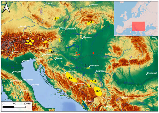 The location of archaeological sites (red dots) of the examined ‘whitestone’ polished stone tools with the serpentinized ultramafic rocks around the Carpathian Basin (yellow shapes with numbers). Alpine serpentinites: (1-1) Burgenland, (1-2) Pohorje, (1-3) Styria, (1-4) Hohe Tauern. (2-1) Serpentinites of the Sudetes, and (2-2) of the Carpathians, Southern Slovakia. Vardar–Dinarid serpentinites: (3-1) Fruška Gora, (3-2) Srednja Bosna, (3-3) Šumadija, (3-4) Zlatibor, (3-5) Kopaonik. The maps are provided by https://maps-for-free.com/layer/relief/z{z}/row{y}/{z}_{x}-{y}.jpg, accessed on 6 March 2025. The projection is in EPSG:23700; HD72/EOV for the maps. Map made by Kata Furholt.
