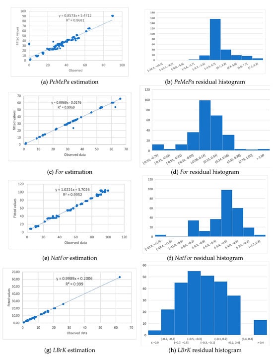 As Figure 2 illustrates, the fitted values are strongly correlated with the observed ones (panels a, c, e, g, i, and k), while the histograms of the residual values are reasonably close to the pattern of the normal distribution—with occasional outlier values (panels b, d, f, h, j, and l).