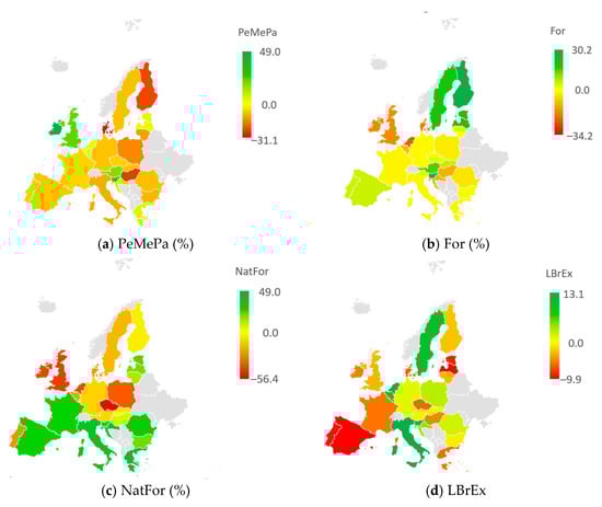The country-level random intercepts vary greatly, indicating that although the general impact mechanisms are similar, their actual level differs by country. Figure 4 shows the country-wise differences for the six dependent variables. Higher proportions of permanent meadows and pastures feature the area in Ireland, the UK, Portugal, Austria and Slovenia (Figure 4a, dark green color); on the low proportion side we can find Hungary, Finland and Denmark (red color). According to the forest-related model equation (Figure 4b), the highest values are characteristic of Sweden, Finland, Estonia, and Latvia. Austria (light green) is relatively close to this group, while at the opposite end are the Netherlands, Denmark, the UK, and Ireland—and to a lesser extent, Hungary and Croatia—where the values are low. The proportion of natural forests within total forest areas (Figure 4c) shows high values for countries by the warm Mediterranean and the Black Sea coastlines, such as Spain, France, Italy, Slovenia, Croatia, Greece, Bulgaria, and Romania, and the Baltic countries. On the opposite end, with a low proportion of natural forests, are the UK, Ireland, the Netherlands, the Czech Republic, and Poland. Regarding biodiversity indicators, the largest proportion of local livestock breeds at risk of extinction are predicted for Italy, Belgium, the Netherlands and Sweden, while the lowest ones are predicted for Spain, Portugal, the Baltic states, and Greece (Figure 4d). The number of local livestock breeds kept (Figure 4e) is low for Sweden, Finland, and the Baltic states, while it is high for Belgium, the Netherlands and Germany, the UK, Hungary, and Slovenia. It is interesting to see that for some countries the low number of local breeds kept is accompanied by a low risk of extinction (the Baltic states, Spain, Portugal, and France), and for others, high numbers of local breeds kept go together with high extinction rates (Belgium and the Netherlands), while there is a tendency of having a high risk of extinction with an already low number of local breeds kept in Sweden, Finland, and Italy. Regarding the plant genetic resources stored (Figure 4f) very high values are seen for the UK, and moderately high values are seen in Bulgaria and Hungary, while the lowest values are seen in Ireland and Portugal, and somewhat in Spain, Greece, Germany, and Austria.