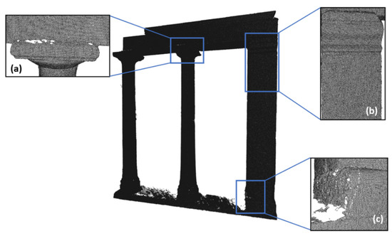 Figure 6 illustrates the triangular mesh of the dense point cloud, which was constructed using the ball-pivoting algorithm and, for the most part, forms a solid surface without gaps (Figure 6b). The level of density of a point cloud is undoubtedly directly related to its ability to describe the surface of the object with the required reliability while at the same time fulfilling the specifications of the scale of the final output. Thus, there is no general definition of point cloud density in terms of a number. The dense point cloud used in this experiment was the product of photogrammetric SfM/MVS processing digital images. However, in certain areas, such as where the capitals of the columns intersect with the architrave, several gaps are evident in the triangular mesh (Figure 6a). These gaps result from insufficient information in the specific regions of the images employed to generate the point cloud. Based on the above, it can be safely concluded that the density of the point cloud is not uniform. The non-uniformity of photogrammetric point clouds is caused by many factors, like inevitable occlusions, varying shadows, presence of texture, distance variations between the objects and the camera, etc.