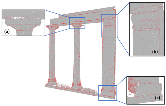 As can be seen in Figure 9, the detected finite edges are more densely concentrated in sections of the mesh where edges are present, such as in the architrave of the temple. However, there are also areas where the finite edges do not correspond to any real edge and have been created due to noise present or due to roughness caused by the wear of the original surface. A typical example of that is the stylobate (Figure 9c), which has suffered significant erosion and shows visible cracks. Consequently, many finite edges have been detected on its surface.