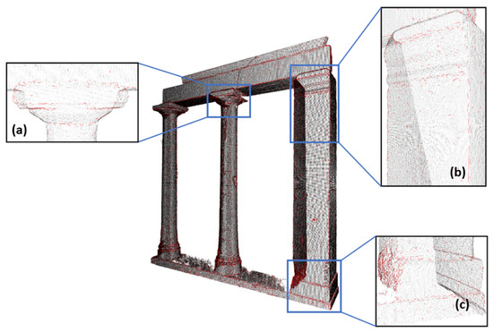 However, in some regions, certain discrepancies were observed between the detected edges and the expected ones. For example, the detected edge on the architrave (2) (Figure 11) is divided into two segments, which do not continue across the entire area above the capitals and show a slight slope towards the upper part of the temple. The discontinuity between the two edges arises due to the gaps in the original triangular mesh, caused by the lower point density in those areas. Additionally, the slope was created during the merging, by RANSAC, from the line segments detected along this edge, as the line segments above the capitals were located at a slightly higher position due to the gaps on the mesh surface. What is more, in the lower section of the pillar (3b) and the stylobate (4) (Figure 11c), there is some damage to the stones with some pieces having fallen off. This causes the creation of scattered edges along these parts of the surface. It is also important to note that between the stylobate (4) and the foundation (5), where there were no problems either with the point cloud or with the triangular mesh, the detected final 3D edges are very close to reality.