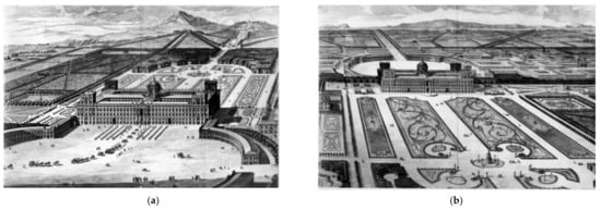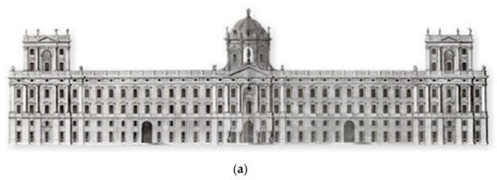 In 1750, King Charles Burbon acquired a piece of land from the Caetani Acquaviva family, located near the Tifatini mountains, north of Naples, with the intention of building a royal palace. This palace was to serve as the administrative and ministerial center of the city, which would include facilities for cultural and judicial institutions, establishing the new capital of the Spanish Kingdom. The ambitious project was designed by Luigi Vanvitelli, a Neapolitan architect of Dutch origin, who had significant experience working on grand architectural projects for the Vatican State. Vanvitelli, well versed in classical architecture and familiar with Vitruvius’ treatise, was also aware of architectural developments from the 15th century. From this knowledge, he developed an original vision, which he applied in the construction of the Royal Palace of Caserta. The architecture of the Royal Palace reflects Vanvitelli’s unique design personality, which, a few decades later, would be considered a cornerstone of the Neoclassical style. However, with Vanvitelli’s death, the construction of the Royal Palace and the urban planning of the city of Caserta remained unfinished. Despite this, the principles that Vanvitelli established for the city’s design would influence urban planning for centuries to come, as shown in Figure 1. The first stone of the Royal Palace was laid on 20 January 1752, marking the beginning of construction, which continued for the next 20 years under the supervision of Vanvitelli. By March 1773, the year of his death, the majority of the palace had been completed. The plan of the Royal Palace is rectangular, with sides measuring 247 m and 190 m, and a total perimeter of 874 m. The overall height of the building is 41 m. The entire surface area is divided into four parts along the main axes, creating four equal courtyards. The palace contains about 1200 rooms and 1742 windows. Based on Vanvitelli’s original vision, the palace was intended to be a multifunctional structure, incorporating not only the royal residence but also housing for soldiers, administrative offices, a chapel, and a theater. Only 134 rooms were designated for the royal family. Access to the palace from Naples was designed as a grand boulevard, now known as Viale Carlo III. Figure 2 shows the drawings of the Royal Palace of Caserta by Luigi Vanvitelli: the frontal view (a) and the principal elevation (b) [,]. The Royal Palace remained the property of the Burbon kings from 1752 to 1860, after which ownership passed to the House of Savoy. In 1919, the entire property was transferred to the public government. Around 1943, the palace served as the headquarters of the Italian Air Force Academy. During World War II, it also became a refuge for exiled individuals.