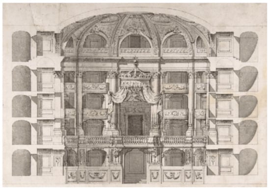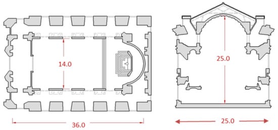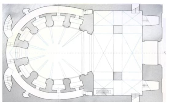 The study of architectural acoustics focuses on creating environments where speech can be easily understood or where there is an optimal listening experience for music. In Ancient Greece and the Roman Empire, numerous theatres were built for public performances. However, the only treatise on acoustics that has reached us is Vitruvius’ De Architectura, written in the 1st century BC. Book V of this work addresses the acoustic problems of theatres and offers suggestions for improving speech intelligibility [,,,,]. De Architectura was rediscovered during the Renaissance and has since influenced generations of architects who designed buildings following Vitruvian principles. In the Renaissance, Athanasius Kircher explored how the geometric shape of a room could influence its acoustic properties. One of his most interesting studies focused on the elliptical shape of ceilings and how this geometry could reinforce voices. Kircher recognized that the ellipse could be used to construct rooms with elliptical vaults, where the foci of the ellipse could facilitate communication over larger distances. He also described how the echo in rooms with circular vaulted ceilings amplified sound, creating surprising acoustic effects [,]. During the Renaissance, architects designed buildings, churches, and theatres based on experience and analogy with rooms that were known for their good acoustics. Furthermore, in the 17th century, numerous studies on theatrical acoustics were conducted. At that time, people began to recognize that sound propagation could be compared to the propagation of light, drawing an analogy between light rays and sound rays. These observations laid the foundation for geometric acoustics, which was later applied to the design of theatres and other types of rooms, such as churches [,,]. For example, after the Council of Trent (1545), preaching practices changed, prompting architectural adjustments in churches. Single-nave churches with flat wooden ceilings became more common as they facilitated better listening during sermons [].