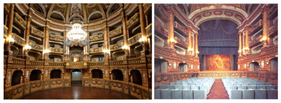 The acoustic measurements were carried out in an empty room condition. The average T30 value is approximately 2 s, which corresponds to a non-optimal condition for speech understanding but is well configured for listening to music since the C80 value is between −2 and 2 dB. For example, the balustrades of the boxes are made of plywood, and the decorations are made of papier-mâché; these materials have high sound absorption. This was Vanvitelli’s choice, the plywood balustrades and papier-mâché reduced the weight of the structure. Table 2 and Table 3 show the average value of EDT and T30 of two theatres like the Court Theatre. The theatres considered are the Theatre Mercadante in Naples and the Comunale Theatre in Benevento. The theatres have comparable volumes between them. There are variations of EDT, but the values of T30 are comparable between them [].