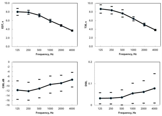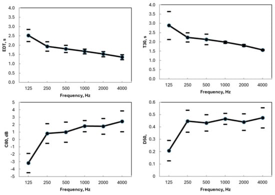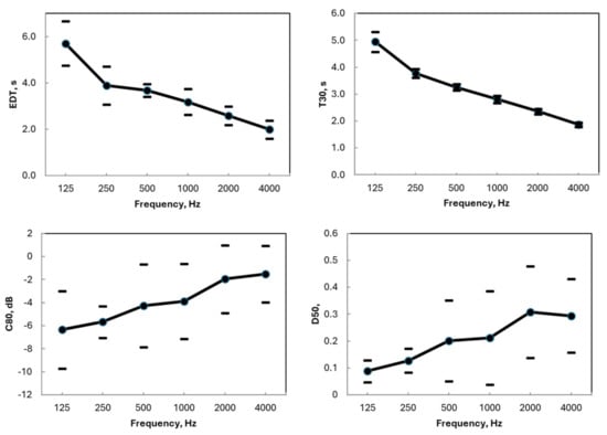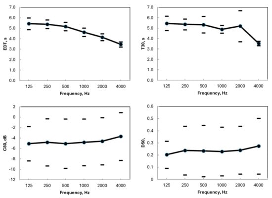 The acoustic parameters analyzed include EDT, T30, C80, D50, and STI. These parameters were defined to characterize how sound is perceived in a room [,,]. A brief definition of each parameter is provided below: