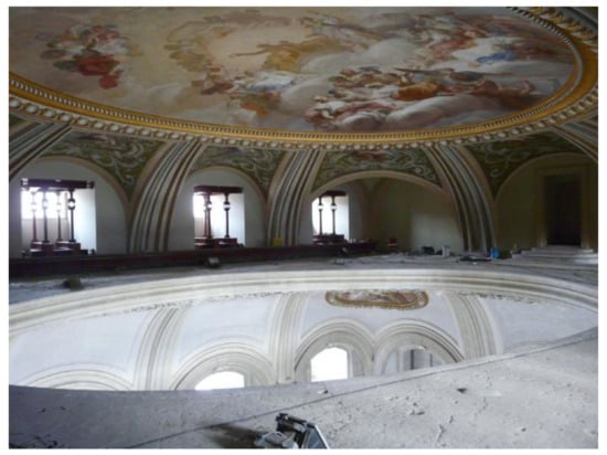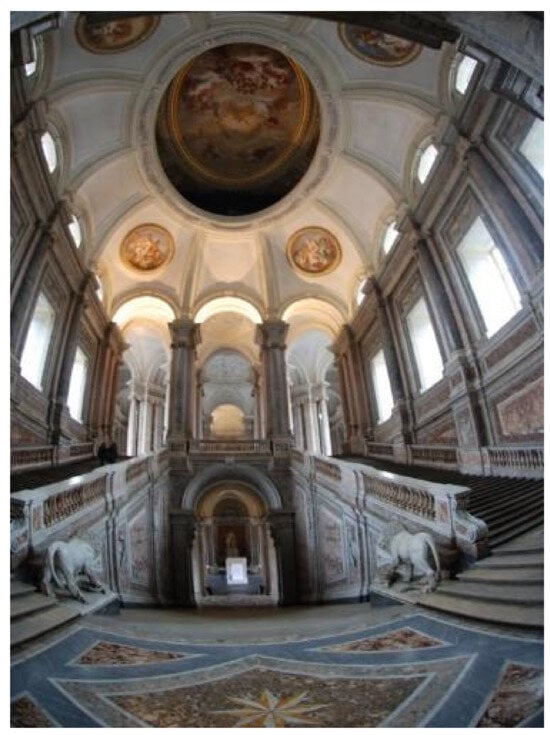 During the Renaissance period, circular and vaulted structures were built and used for aesthetic and structural purposes in places of worship, monumental buildings, and courtyards. In vaulted environments, sound reflection focuses on the central area due to the convergence of multiple reflections, generating unique acoustic experiences for visitors exposed to these phenomena. In the central area, beneath the highest point of the vault, repeated echoes occur. Echoes are defined as the delayed repetition of sounds. Focusing effects can result in high sound pressure levels, echoes, and tonal coloration. Concave surfaces create a convergence of sound energy, amplifying sound near the focal point (compared to a flat surface) while attenuating sound in other areas (far from the focal point). Despite their complexity and the acoustic risks associated with irregular sound distribution, fluctuating echoes, and tonal coloration, focusing effects can often lead to positive acoustic outcomes. These phenomena are frequently excluded from the acoustic design of halls, though, in some cases, they enhance the acoustic experience. The monumental staircase is one of the most complex structures in the Reggia of Caserta. It consists of a central ramp of steps that parallel each other after the first landing, which has a width of 5 m, continuing to the upper vestibule. The staircase is connected to a long corridor leading to the entrance of the palace. The total area of the staircase covers 600 m2, with a height of 42 m. The elliptical hole has main axes measuring 10.9 m and 14.6 m. From the first level of the vault, it is possible to view the second vault above, decorated with frescoes representing the four seasons and the throne of Apollo, as shown in Figure 10 and Figure 11 [].
