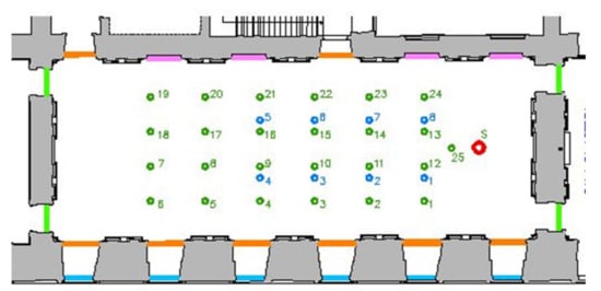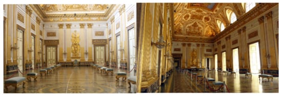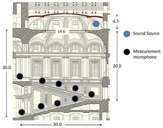 Several acoustic measurement campaigns were conducted in the Royal Palace of Caserta. The equipment used consisted of a dodecahedron sound source (Peecker Sound, Reggio Emilia, Italy) connected to an amplifier (Peecker Sound KT 150), which generated a Maximum Length Sequence (MLS) signal. This signal was recorded by an omnidirectional microphone (GRAS 40 AR, Skovlytoften, Denmark). The impulse response (IR) was then processed to obtain the acoustic parameters using Dirac software (Uppsala, Sweden). The acoustic measurements were conducted according to the ISO 3382-1 standard [].