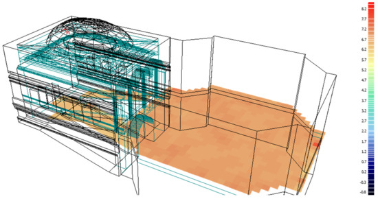 Spatial distribution of T30 in octave band at the frequency of 1000 Hz, obtained with the Ramsete software (Parma Italy, http://pcfarina.eng.unipr.it/ramsete/ (accessed on 3 February 2025)).