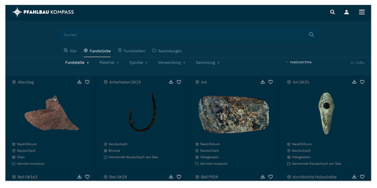 PfahlbauKompass is a web application that offers the possibility to view the pile dwelling objects and get information about the prehistoric artefacts, the time of their use, and the pile dwellings themselves [11]. This is a form of digital collection explorer and was programmed by the digital agency lowfidelity Heavy Industries using Drupal. Users can search for specific objects, create their own digital collections of 3D models (embedded from Sketchfab), and download them for printing. In addition, PfahlbauKompass contains basic information on the prehistoric pile dwellings in Austria and the transnational UNESCO World Heritage Site. It is therefore not just a 3D object archive but resembles a virtual exhibition for your pocket. Users not only get an overview of the available material but also the contact points for further studies.