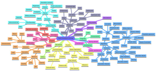 The FAIR Ontology and EAGLE vocabularies are rooted in Greco-Roman community practices, where inscriptions primarily served civic, legal, and administrative functions, alongside religious purposes. Their classification logic is function-oriented and hierarchical, prioritizing standardization across diverse corpora. For example, the FAIR Epigraphy system, particularly the Types of Inscriptions Ontology, is designed to ensure consistency and interoperability by employing a hierarchical structure. At its core, the ontology begins with a root class, “Types of Inscriptions,” which then branches into 15 primary categories, including Anepigraphic (objects or contexts devoid of textual inscriptions), Commemorative (inscriptions created to memorialize events, individuals, or achievements), Didascalic (inscriptions tied to learning or writing practices), Entertainment (inscriptions associated with leisure and games), Expressive (inscriptions that convey emotions, greetings, or personal messages), Honorific (inscriptions celebrating individuals, groups, or deities), Identification (inscriptions that identify ownership, origin, or production details), Non-lexical (inscriptions lacking traditional text but carrying significant symbolic meaning), Pragmatic (inscriptions with functional purposes, such as communication or announcements), Record-keeping (inscriptions that document administrative or historical information), Regulatory (inscriptions tied to laws, agreements, or spatial management), Religious (inscriptions with spiritual or liturgical content), Space organization (inscriptions that facilitate navigation or spatial arrangements), and Unable to determine or Unassigned (categories that account for inscriptions that cannot be definitively classified or remain unassigned). Each category is further subdivided into secondary, tertiary, and additional levels, allowing for precise classification and better interoperability with other digital frameworks. Further analysis of the classes and terms revealed that 14 categories out of 15 are dedicated to textual inscriptions, further subdivided into 114 subcategories. This reflects a text-oriented cultural tradition, where written records were the dominant form of public communication. For example, in the FAIR Ontology, Anepigraphic inscriptions refer to objects that, while typically associated with inscriptions, lack visible text or lettering. These objects may contain decorative elements, images, or paintings, yet they are still classified as epigraphs due to their form, material, and contextual significance. This distinction allows non-textual artifacts to be included in epigraphic studies while differentiating them from purely decorative images. Alternative labels for such inscriptions include “Uninscribed” (English) and “Anepígrafa” (Spanish), closely aligning with the EAGLE vocabulary (Figure 4 and Figure 5).