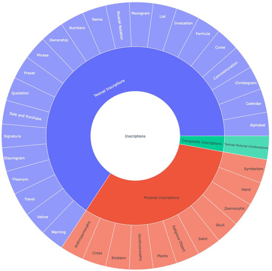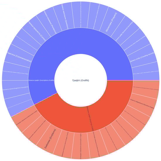 Modern digital resources, such as the “Saint Sophia’s Inscriptions” portal13 and the Inscriptions of the Northern Black Sea Region (IOSPE)14 repository, further enhance the understanding and categorization of Ukrainian epigraphy. The Ukrainian/English bilingual portal “Saint Sophia’s Inscriptions”, based on the corpus of graffiti of Sofia Kyievska [19,20,21,22,23,24,25,26], presents a structured digital categorization of inscriptions found in Saint Sophia Cathedral, based on Korniyenko’s classification principle with several adjustments (Figure 3).