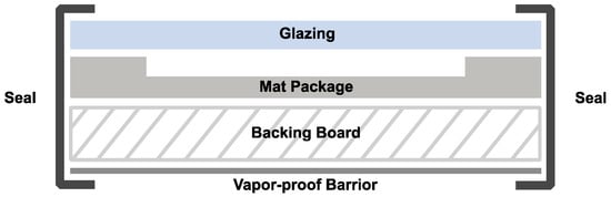 That said, there are a wide variety of SFP designs currently being used for paper-based objects on open display and during transit; some designs are unique and some are variations on published designs [11,12,13,14,15]. The most common SFP designs include (i) glazing, (ii) an object supported by a back mat/mount (typically window-matted), (iii) a backing board, (iv) a vapor-proof barrier, and (v) a seal (archival pressure-sensitive tape or a metallic, heat-set laminate) (Figure 1). The first four components have the same length and width dimensions, are stacked from top to bottom in the order listed here and held, or sealed, together by the fifth component around all four edges to create a sealed frame package (SFP). In some instances, the corners are reinforced with additional seal material, as was the case in this project. This assembly can then be inserted into a frame for display purposes, or used for physical and environmental protection in storage without a frame.