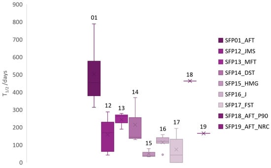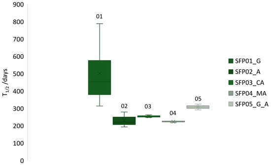 | SFP Sample No. | SFP Identifier | Average T1/2 with Induction Period (Days) | StDev. | Average T1/2 without Induction Period (Days) | StDev. | Average Time to 60% Threshold (Days) | StDev. |