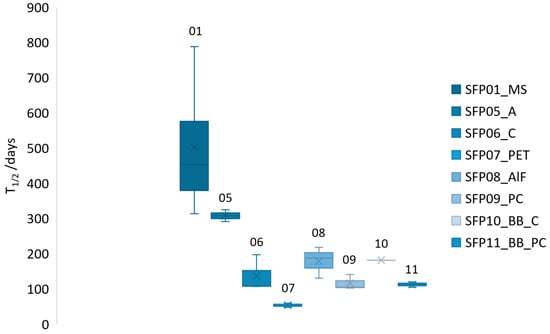 This approach enables characterization and comparison of the performance of the SFP designs tested based upon hygrometric half-life values expressed in days. Low t1/2 values indicate an SFP with a fast moisture equilibration rate, corresponding to a shorter time required for RH conditions within the package to match the external environment. High t1/2 values point to a SFP design characterized by a slow moisture equilibration rate, corresponding to a longer time required for RH condition within the package to match the external environment. For SFPs in which the RH reached the 50% equilibration mark during the test period, the actual t1/2 was compared to the calculated t1/2.