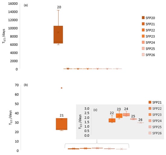 Box and whisker plots showing the hygrometric half-life for the control packages: (a) data relating to all control packages; (b) control data excluding SFP20 (G_BB_BaggedMS_NA); (c) inset showing details of control data excluding SFP20 and SFP21 (G_BB_BaggedPE_NA), demonstrating rapid rates of equilibration. The boxes represent the 25th and 75th percentile for each dataset, with the whiskers representing minimum and maximum values. The interior line is the median value, the cross marker is the calculated mean value, and the dots represent outliers.