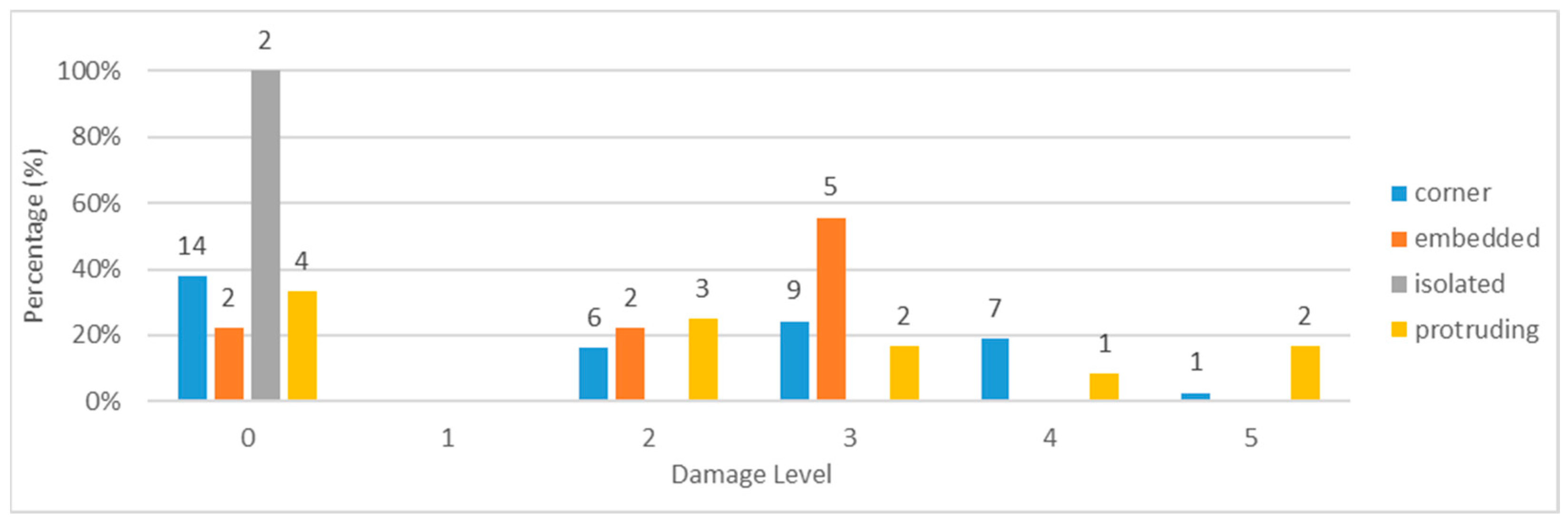 - Coïsson, E.; Ferretti, D.; Lenticchia, E. Analysis of damage mechanisms suffered by Italian fortified buildings hit by earthquakes in the last 40 years. Bull. Earthq. Eng. 2017, 15, 5139–5166. [Google Scholar] [CrossRef]