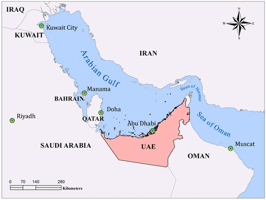 The United Arab Emirates (UAE) was founded on 2 December 1971, originally consisting of Abu Dhabi (the capital), Ajman, Fujairah, Sharjah, Dubai, and Umm Al Quwain. Ras Al Khaimah joined the union on 10 January 1972 [5]. Situated on the eastern side of the Arabian Peninsula, the UAE shares borders with Oman to the east and Saudi Arabia to the southwest (Figure 1). Its strategic location along the Arabian Gulf has historically connected it to maritime trade routes linking the Middle East, East Africa, South Asia, and beyond.