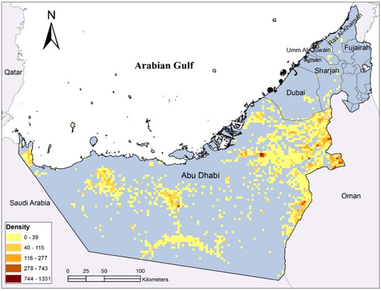 The majority of the UAE’s camel population (89.7%) is located in Abu Dhabi, followed by Sharjah (4.6%), Umm Al-Quwain (2.3%), Ras Al-Khaimah (2.2%), Ajman (0.6%), Dubai (0.3%), and Fujairah (0.3%) [48]. Since Abu Dhabi covers 67,340 square kilometers or 84% of the UAE’s total land area [48], camels are effectively spread across the entire country (Figure 5). Additionally, the camel population in the UAE consists of 15.2% males and 84.8% females [48]. This imbalance is due to several factors: female camels are essential for breeding programs, highly valued for their milk production, and preferred for riding and racing activities.