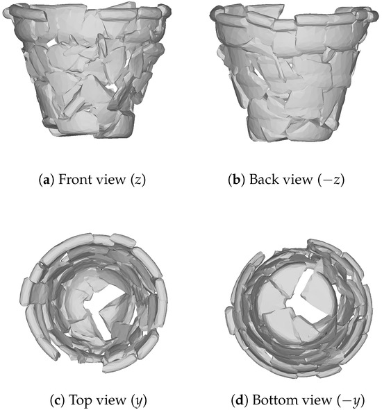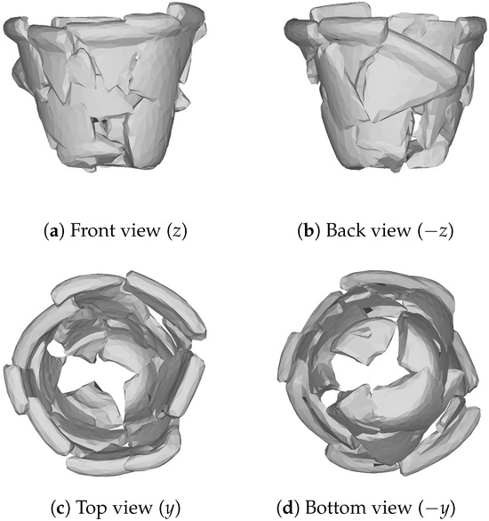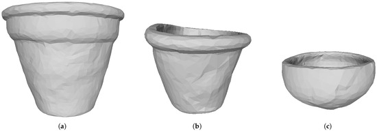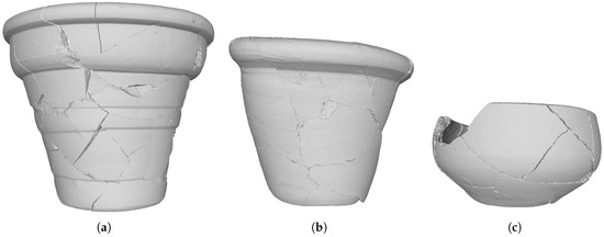To virtually restore those vessels, it was necessary to stitch the sherds together in a single 3D model for each vessel. Considering the high precision of the scanned sherds’ meshes, making that procedure feasible required applying a decimation process to every mesh. In this work, the Quadric Edge Collapse Decimation filter [26] available in the Meshlab API [27] was employed. The restored vessels can be seen in Figure 3. Those 3D models were the input for generating the synthetic data used during training as a surrogate to overcome the lack of training data.