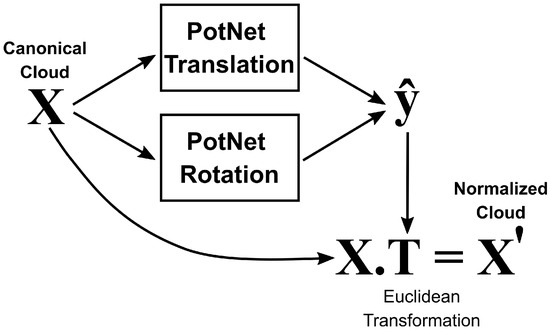In this work, the Kabsch algorithm [33,34] is used to compute the rotation components of the training targets . The Kabsch algorithm is a method to calculate the optimal rotation matrix that minimizes the root mean squared deviation between two paired sets of points. The translation coefficients are computed as the distance between the centroids of the normalized and canonical point clouds.