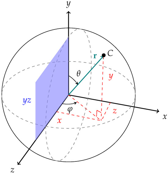 Bringing the centroid to the desired position is made easier by defining a spherical coordinate system (see Figure 5). Given , the Cartesian coordinates of the centroid C, Equation (1) presents the rotation matrix that brings such a point cloud to its normalized position.