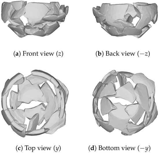 To address the well-documented high data volume demanded for training deep learning models, we devised a way to automatically produce synthetic sherds. In that regard, we employed the Cell Fracture tool, a native feature of Blender software conceived to break up digital object models into an arbitrary number of sherds. The tool is based on a 3D Voronoi Diagram implementation designed for polyhedron fragmentation [35,36]. Cell Fracture implements a non-deterministic approach, the outcome of which is influenced by some parameters, including the maximum number of fragments provided and a seed for noise generation ranging from 0 to 1. For a regular object like a cube, 0 means more regular shapes, and 1 means more natural shapes for the breaking results. For uneven objects, the Voronoi point distribution is always random. Thus, the results have uneven and natural shapes. So, even when fixing the noise parameter value, the point distribution in the breakage process is still random. In this work, the noise parameter value was fixed at 0.5. The maximum number of sherds in each break was set up to be the upper bound of the total number of real sherds for each vessel.