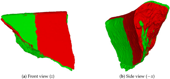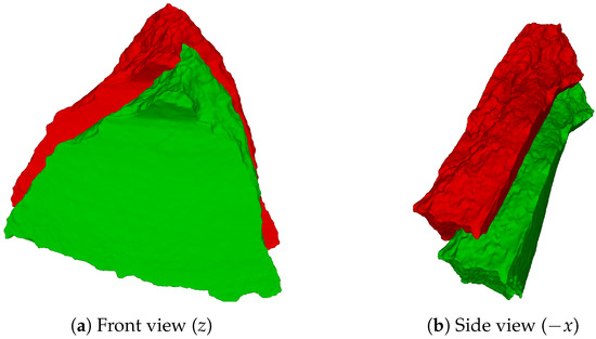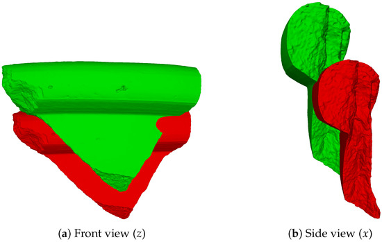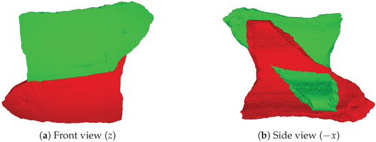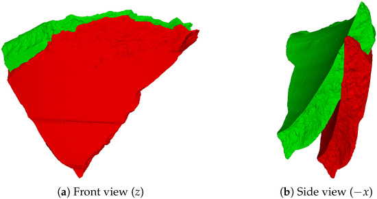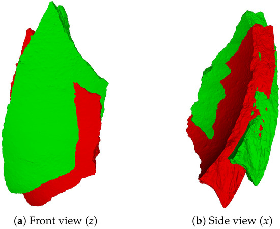 After prediction, every point in the canonical cloud is multiplied by the corresponding matrix, resulting in , a predicted point that should fit , its homologous aspect in the ground truth normalized cloud. The predicted sherd point positions were compared to the respective reference normalized positions in order to compute the relative errors. Since the predicted and normalized point clouds of a sherd have exactly the same points, the exact error between those two clouds can be computed. The errors are calculated considering each point and each coordinate axis. From the differences of each point position, we computed the Root Mean Square Error (RMSE), given by Equation (4).