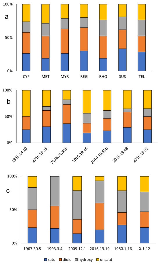 Figure 2a shows the relative similarity in fatty acid composition across the seven replica perfume recipes. These results are from single DART-MS analyses of each perfume, so the variation between the classes likely is a measure of the overall variation in the compositions, as the perfume kit was stored as a single unit. Considering that the perfumes were stored in the dark and tightly sealed, the proportion of dioic acids is quite interesting, as is the significant proportion of hydroxy acids. Over the centuries of burial, any perfume residues in the unguentaria would likely lose nearly all of the unsaturated fatty acids, which would result in a higher proportion of dioic acids in the ancient samples.